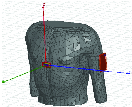כעת נבצע סימולציה של שידור מאנטנה בהתקן מד הדופק לאנטנה בטלפון הסלולארי בנוכחות גוף האדם. ניתן להשתמש במודל מאוד מפורט של גוף האדם (הכולל איברים פנימיים, עור, ורידים וכו’), אבל כיוון שאנו רוצים רק להמחיש את הרעיון, לא נשתמש במודל כל כך מפורט. בנוסף לכך, הרבה מהאיברים בגוף האדם אינם משפיעים על ביצועי התקשורת הנ”ל. הפרמטרים החשמליים של גוף האדם בתדר 2.4GHz בסימולציה שביצענו הינם .