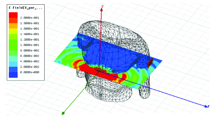 האנטנה של הטלפון הסלולארי נמצאת בשדה הקרוב יחסית לאנטנה של התקן מד הדופק. איור 3 מתאר את השדה החשמלי הקרוב (V/m), כאשר עוצמת השידור 0.1mW.