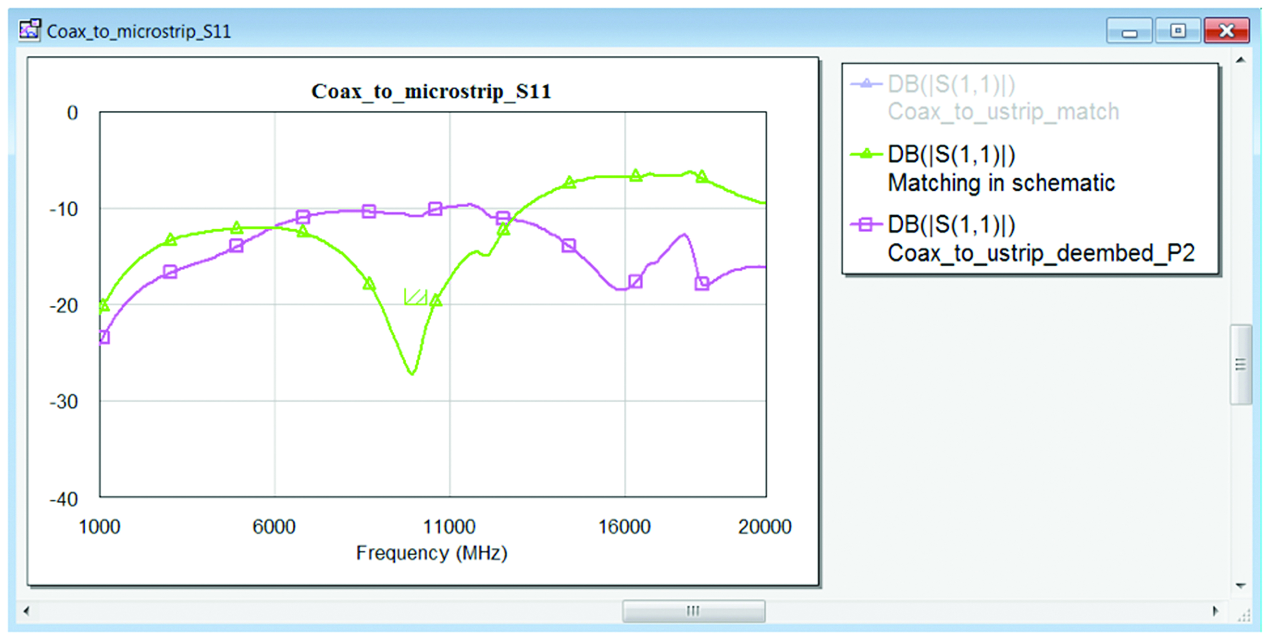 איור 5. מקדם ההחזרה של המעבר בהדק הקואקס תוך שימוש במודלי צורה סגורה של המעגל המתואם (גרף ירוק)
