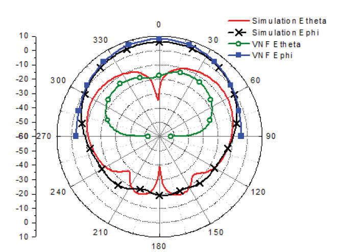 פילוג אחיד של שדה-H משמש בבדיקה זו. ערכי השדה מופקים בפתח של 16 סמ’ x עם דגימות כל 1 סמ’ תוך יצירה של מערך מדידה הכולל 16×24. ערכים אלה נבחרו כדי להתאים למערכת המדידה של שדה-קרוב-מאוד הממומשת הנדונה בהמשך במאמר זה. האמפליטודות של מדידות אלה נקבעו באחידות ל-1A/m וכל המופעים נקבעו לאפס מעלות כדי לדמות את הפתח המקרין בצד הרחב (broadside). הקיטוב הוא בציר Y או לאורך Phi=900. המדידות בשדה-הקרוב הוטמנו בקוד של מערכת המדידה של השדה הקרוב-מאוד ותבניות הקרינה של השדה-הרחוק בשני המישורים הראשיים ו-Phi=900 מושוות עם התוצאות התיאורטיות המוצגות באיור 1.