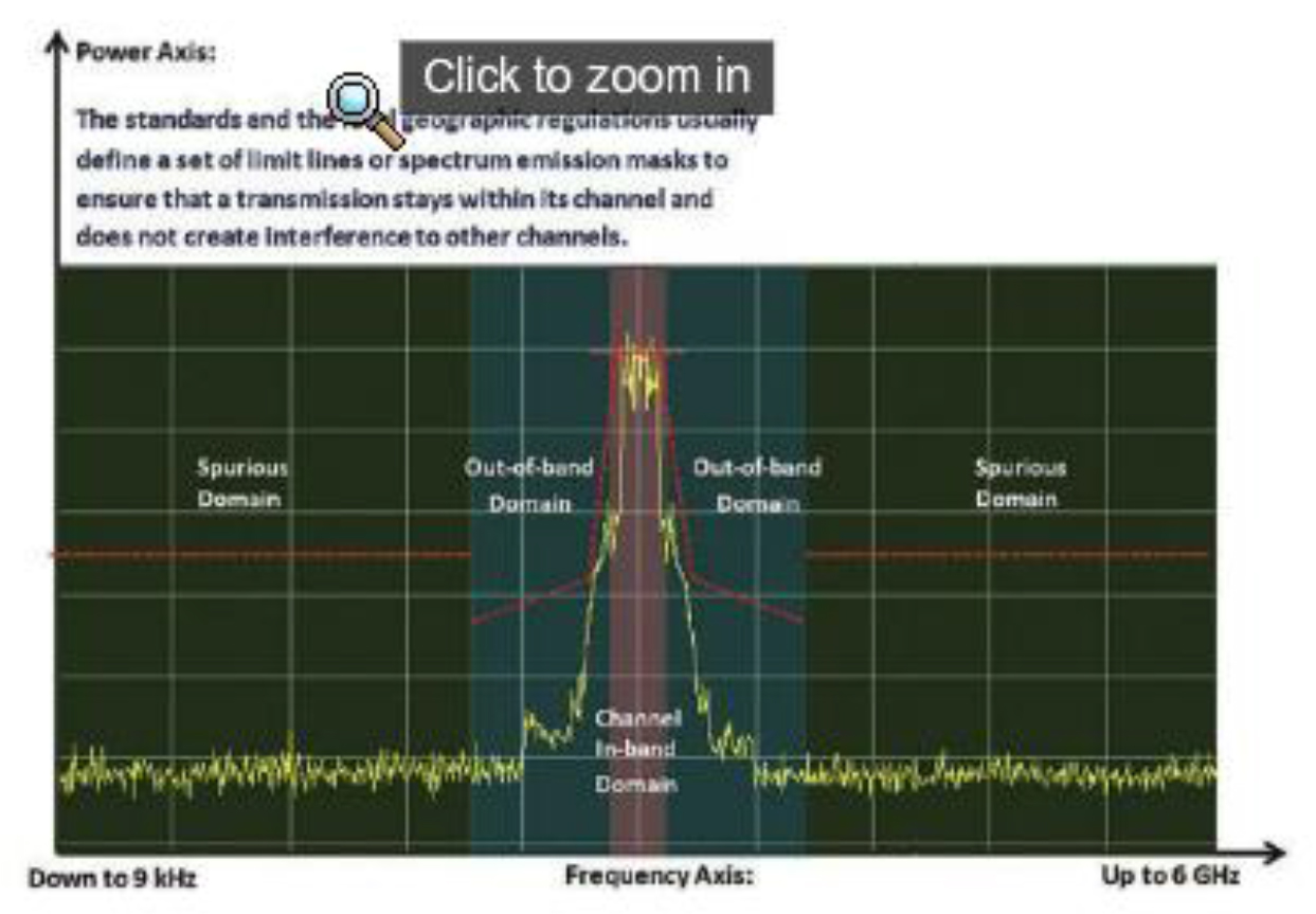 לשם בדיקת טרום-התאמה, מישור התדר מחולק לשלושה תת-מישורים או אזורים (איור 4). קיימת בדיקת טרום-התאמה של הספקטרום בעלת שלושה שלבים, המורכבת ממישור תוך-תחומי (ערוץ) (בודק את מוצא הספק השידור, רוחב-הפס של השידור וצפיפות ספקטרום ההספק); מישור חוץ-תחומי (בודק את פליטת הספקטרום או יחס הספק הערוץ הסמוך (adjacent channel power ratio -ACPR). המסכה מוגדרת בד”כ על-ידי תקני התקשורת דוגמת ה-IEEE והתחום האקראי, כדי לבדוק רמות פליטה אקראיות.