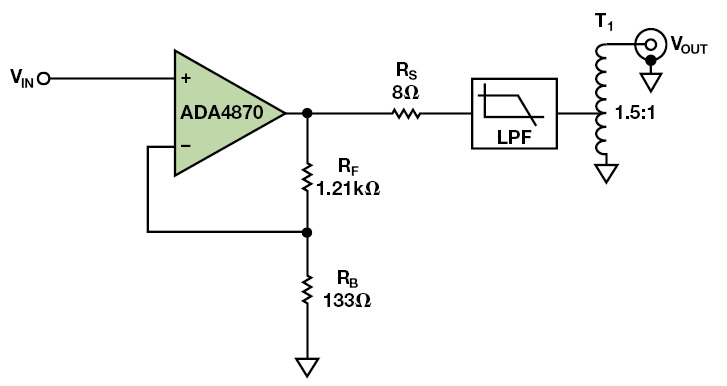 איור 10. חיבורי ADA4870 עבור תכנון בעל פדים במוצא. עכבת המבוא מופיעה כ-50 אוהם לכל ההחזרות בתוך התחום בעל עניין