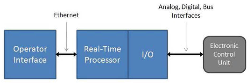 בהסתכלות על איור מספר 1 ניתן להבחין בין שתי יחידות: המלבן הרחב מבצע אלגוריתמים בזמן אמת, וגם כוללת פונקציות I/O שפועלות בזמן אמת (latency ו-jitter נמוכים). הריבוע הכחול השני כולל את ממשק המפעיל: הכנסת פרמטרים לבדיקה, ומצד שני קבלת המידע מהבדיקות, לרוב גם בצורה גרפית.