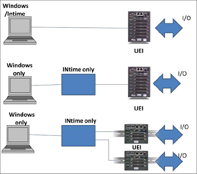 לאחר שבחרנו במערכת ההפעלה לזמן אמת ניגש לבחור את אופן הפעלת ה-I/O שלה. קיימים יצרנים רבים שמציעים ממשקי I/O לפרוטוקולים שונים. בוחרים כרטיס PCI שמבצע קריאת Analog Input (למשל), בוחרים כרטיס אחר שמבצע High Speed Serial Output (למשל), מחפשים עבור שניהם Drivers או מפתחים את ה-Driver, וכך משלימים את כל הממשקים הדרושים. מאידך יתואר במאמר אופן מימוש נח הרבה יותר של כל (או רוב) ממשקי ה-I/O על ידי יצרן אחד – חברת UEI שמציעה יחידה חיצונית מוקשחת שמכילה את ממשקי ה-I/O הדרושים. מערכת ה-I/O הזו הקרויה PowerDNA ומתוארת באיור מספר 2.