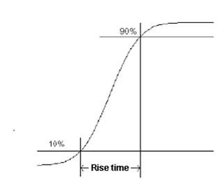 איור 3. זמן העלייה מגדיר את הזמן הדרוש כדי לעבור מ-10 ל-90 אחוזים מערך הסקאלה המלאה. זמן העלייה ורוחב-הפס קשורים ישירות וניתן לחשב אחד מהשני תוך שימוש בנוסחה לעיל.