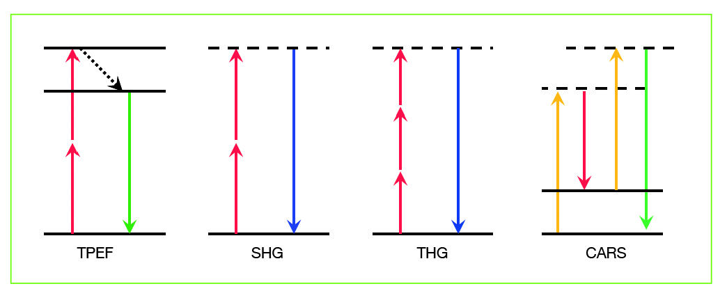 בשאלות ביולוגיה רבות, החוקרים מבקשים לראות את נושא ההתעניינות שלהם ברזולוציה תלת-ממדית (3D) ברמה התאית (cellular). במיקרוסקופ בעל מוקד משותף, רזולוציית 3D זאת מושגת על-ידי חריר, הדוחה את הפלואורסנטיות מחוץ-למוקד ומשיג רזולוציה של כ-200 עד 250 ננו-מטר רוחבית ו-500 ננו-מטר צירית. לטכניקות של מיקרוסקופיה לא-ליניארית דוגמת הדמיית עירור של 2 פוטונים (שהוכחה לראשונה ב-1990 [1], יצירת הרמוניה שנייה (Second Harmonic Generation – SHG), יצירת הרמוניה שלישית (Third Harmonic Generation – THG) או Coherent Antistokes Raman Scattering מאידך, יש יתרון גדול, שהן מספקות עצמותית (intrinsically) רזולוציית 3D וכל התאורה הפלואורסנטית המיוצרת יכולה לשמש ליצירת התמונה. לדוגמה, מיקרוסקופיים עירור 2 פוטונים (2-photon) משתמשת בעובדה שפלואורופור יכול לספוג ביחד שני פוטונים של כ-כפליים אורך-הגל העירור של פוטון אחד (כלומר מחצית האנרגיה הדרושה כדי לעורר את הפלואורופור). תהליך זה תלוי בריבוע עצמת התאורה ולכן יופיע רק במוקד האובייקטיב עצמו, תוך יצירת “חלוקות אופטיות” (optical sections) של הדגימה הדמויה (עם רזולוציה דומה למיקרוסקופיה בעלת מוקד משותף). דבר דומה תקף עבור ה-SHG, בהבדל שזהו תהליך קוהרנטי ודורש מבנים לא centrosymmetric. מבנים כאלה מסוגלים להמיר את האור הפוגע למחצית אורך הגל הראשוני (לדוגמה מ-900 ננו-מטר ל-450 ננו-מטר). בדגימות ביולוגיות, בעיקר קולאגן, microtubules או myosin יוצרים אותות SHG מספיק חזקים עבור ההדמיה. איור 1 מראה את רמות האנרגיה של טכניקות ההדמיה הלא-ליניארית המוזכרות לעיל.