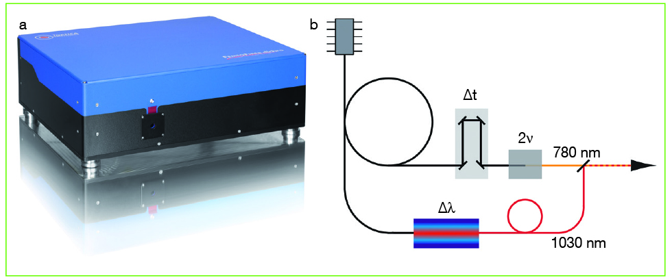 - איור 2. לייזר הסיב בעל שני צבעים FemtoFiber dichro מספק 780 ננו-מטר ו-1030 ננו-מטר ובנוסף אורך-גל מדומה (888 ננו-מטר) עבור מיקרוסקופיה של 2 פוטונים. מאחר ששני אורכי-הגל באים מאותו מתנד, הפולסים מסונכרנים בשלמותם. קו-השהייה מאפשר הזזת אורך-גל אחד לעומת השני, כדי לכוון את החפיפה הזמנית של הפולסים בדגימה