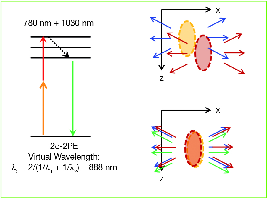 בשל תכונות אלה לייזר הסיב הוא מקור אור מבטיח עבור מיקרוסקופיה של שני פוטונים. ניתן להשתמש בשני אורכי-הגל בנפרד עבור 2-PE מקובל של פלואופורים מתאימים. בנוסף, עיצוב לייזרי מיוחד זה מאפשר עירור של פלואורופורים עם מירב של 2-PE בין שני אורכי-הגל במוצא. כאשר הפולסים של שני אורכי-הגל חופפים במרחב ובזמן, עשוי לקרות תהליך המכונה 2-color 2-PE (איור 3). תהליך זה כבר הוכח בהיערכות טכנית שונה, ראה לדוגמה [5]. הפלואורופור קולט ביחד פוטון של 780 ננו-מטר ופוטון של 1030 ננו-מטר. דבר זה מתאים לאורך-גל של עירור וירטואלי של , אורך-גל המאפשר לדוגמה לעורר GFP.