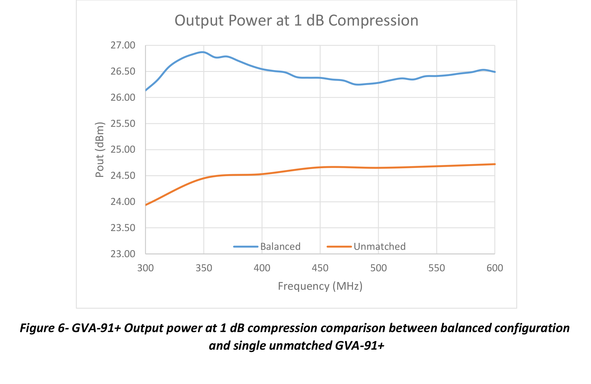גרף 6. מגבר GVA-91+ השוואת הספק המוצא בדחיסה של 1dB בין התצורה המאוזנת למגבר GVA-91+ בודד לא מתואם