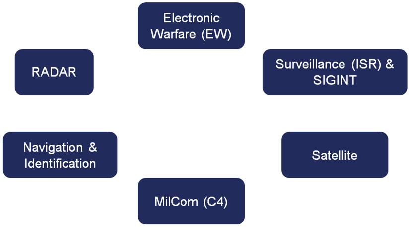 ניתן לחלק את סביבת התעופה, החלל והביטחון לפי מספר גישות. בעת הדיון בציוד בדיקה ומדידה עדיף לחלק אותה לתחומים פונקציונליים נפרדים, כפי שמוצג באיור 1. ישנן טכנולוגיות שונות המשמשות במגזרי תעשייה רבים. אלה כוללות, בין היתר, אנטנות מערך, מערכות רב תפקודיות, עיבוד אותות מעורבים ופעולה בתדרי גמ”מ.