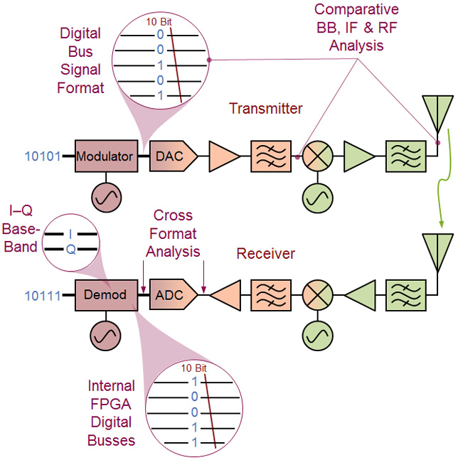 כפי שמציין איור 4, ניתוח מרובה פורמטים הוא לעתים צורך חיוני בפתרון בעיות. מאחר שמרבית תכני הלוויין הדיגיטליים מומרים בסופו של דבר בחזרה לאותות אנלוגיים, לעתים קרובות יש צורך להשוות את האות האנלוגי לאות הדיגיטלי שיצר אותו מלכתחילה. הדבר דורש יכולת ניתוח חוצת מישורים כדי להשוות פרמטרי אפנון בין האות הדיגיטלי לבין האות האנלוגי.