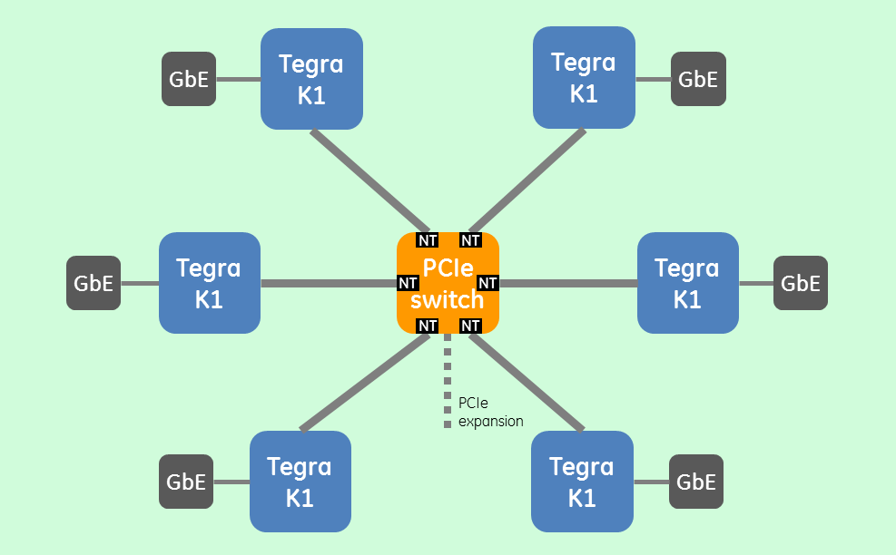 יישומים מסוימים עשויים להזדקק למספר שבבי Tegra העובדים במשולב כדי לענות על צרכיהם. ניתן להעמיד זו לצד זו מערכות SoC המכילות צברים (clusters) של Tegra K1 ולחברן באמצעות יציאות PCIe או חיבור Ethernet (תמונה 6). יתרונות הגודל, המשקל וצריכת החשמל המושגים מישום ארכיטקטורת “אריחים” כזו הינם משמעותיים ומרחיבים את השימוש בשבבי TK1 למרכזי מידע ומיחשוב לביצועים גבוהים (HPC). ניתן להשיג טופולוגיה צפופה עם 4,6,8 או יותר מערכות על שבב מסוג TK1 על לוח אחד, ולספק יכולת הרחבה (scalability) חיונית הן ליישומים משובצים והן למערכות HPC. אם נסתכל על הדוגמא להלן המבוססת על מערכת משובצת קיימת, המשתמשת בשישה TK1: ששת שבבי ה-TK1 מחוברים ביניהם באמצעות PCIe gen2 x4 ובאמצעות מתג PCIe בעל 32 נתיבים, NTB ומנועים המאפשרים פריקה של ה-DMA. תצורה זו בצירוף עם ספרית RDMA קלת-משקל שרצה בזכרון המשתמש, מאפשרים תקשורת עם תקורה נמוכה בין מעבדי TK1. בינתיים, התממשקות לחיישנים מתאפשרת באמצעות