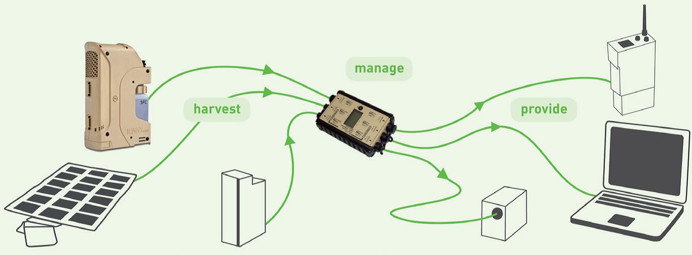 ו-7 פעמים גבוהות יותר מאשר סוללות ) החיילים יכולים לשאת לאורך דרך ארוכה מאגר אנרגיה חשמלי במשקל ונפח מינימליים. ניהול צריכת חשמל חכמה מאפשר פעולה היברידית עם מקורות אנרגיה אחרים, כמו-פנלים סולאריים וחשמל של הרכב ועוד.