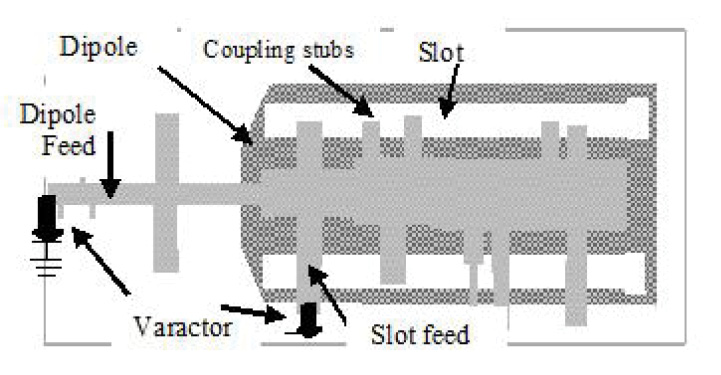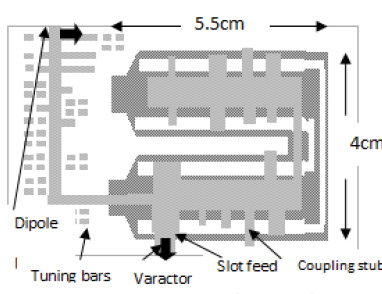 אנטנה מיקרוסטריפ דו-קוטבית קומפקטית עמוסה תוכננה על מנת לספק קיטוב אופקי. האנטנה מכילה שתי שכבות. השכבה הראשונה מכילה תשתית דיאלקטרית עשויה מחומר RO3035 בעובי של 0.8 מ”מ. השכבה השנייה מכילה תשתית דיאלקטרית עשויה מחומר RT-Duroid 5880 בעובי של 0.8 מ”מ. עובי התשתית משפיע על רוחב הפס של האנטנה. אנטנה מודפסת בעלת חריץ, מספקת קיטוב אנכי. האנטנה המודפסת הדו-קוטבית והאנטנה בעלת החריץ, מספקות קיטוב אנכי. ממדי האנטנה הדו-קוטבית הנם 26 ס”מ על 6 ס”מ על 0.16 ס”מ. תוכננו גם אנטנות דו-קוטבית מקופלות קומפקטיות מתכווננות. ממדי האנטנות הקומפקטיות הנם 5 ס”מ על 5 ס”מ על 0.05 ס”מ. הואראקטורים מבוקרי מתח משמשים לבקרת תדר התהודה של האנטנה. אפשר להשתמש באנטנה כאנטנה לבישה על גוף האדם. האנטנה ניתנת להצמדה לחולצת החולה באזור בטנו של החולה או באזור הגב. האנטנה נותחה באמצעות שימוש בתוכנת ADS.