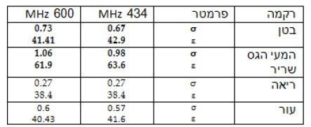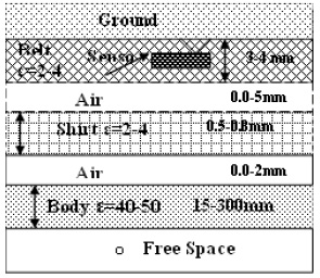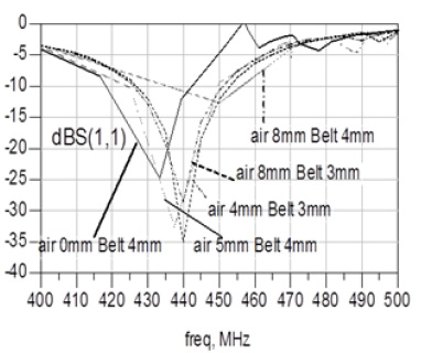 השתנות התנגדות הכניסה של האנטנות כפונקציה של המרחק מהגוף, חושבה באמצעות תוכנת ADS. המבנה המנותח מוצג באיור 9. תכונות רקמת הגוף האנושי מוצגות בטבלה 1. איור 10 מציג תוצאות S11 עבור עוביי חגורה וחולצה שונים ועבור רווח אוויר בין האנטנה לגוף האדם. אם רווח האוויר בין החיישנים וגוף האדם מוגדל מ-0 מ”מ ל-5 מ”מ, תדר התהודה של האנטנה מוזז ב-5%. קיימת התאמה טובה בין התוצאות הנמדדות והחישוביות. ניתן להשתמש בואראקטור מבוקר מתח לכוונון תדר התהודה של האנטנה בהתאם למיקום האנטנה על גוף אדם.
