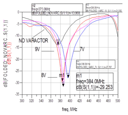 איור 2 מציג את הפרמטרים הנמדדים ללא ואראקטור. איור 3 מציג את הפרמטרים כפונקציה של ערכי קיבוליות ואראקטור שונים. איור 4 מציג את תדר התהודה של האנטנה המתכווננת כפונקציה של קיבוליות הואראקטור. תדר התהודה של האנטנה משתנה סביב ה-5% עבור ערכי קבול של עד 2.5 פיקופאראד. רוחב רוחב אלומת הקרינה של האנטנה הוא