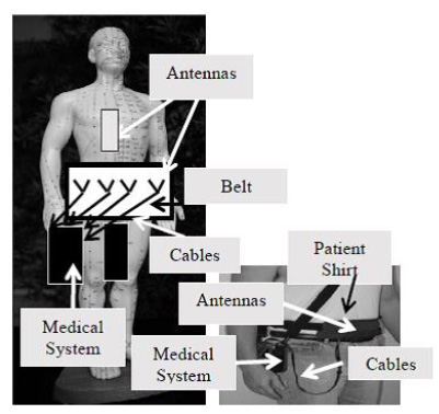 יישום של האנטנה המוצעת מוצג באיור 16. ניתן להרכיב שלוש עד ארבע אנטנות דו קוטביות מקופלות מתכווננות בחגורה, ולהצמיד אותן לבטן החולה. הכבל היוצא מכל אנטנה, מחובר למקלט. האות המתקבל מנותב למטריצת מיתוג. האות עם הרמה הגבוהה ביותר ייבחר בעת הבדיקה הרפואית. האנטנות מקבלות אות המועבר ממקומות שונים בגוף האדם. כמו כן, ניתן להצמיד אנטנה מתכווננת מקופלת לגב החולה על מנת לשפר את רמת האות המתקבל ממקומות שונים בגוף האדם. ביישומים אחדים, המרחק המפריד בין האנטנות המשדרות ואלה הקולטות, הוא פחות מ-, כאשר D הוא הממד הגדול ביותר של מקור הקרינה. הוא אורך הגל.