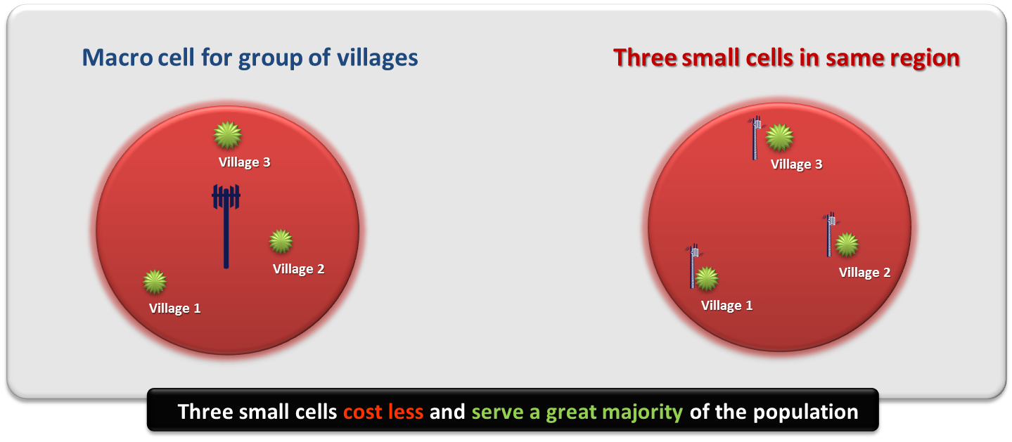 טכנולוגיית small cells שימשה במקור את תעשיית הסלולר כפתרון להעצמת הכיסוי באזורים עירוניים, בהם תדרים גבוהים יותר אשר הוקצו לרשתות 3G לא יכלו לחדור למבנים ופגעו בקישוריות. על מנת לפתור בעיה זו, הם הוצבו בכל קומה במבנים גבוהים. לאחרונה מתייחסים אליהם כפתרון לאזורים מרוחקים בעלי אוכלוסייה דלילה, המאפשר כיסוי ברדיוס של 3 קילומטר. כאשר משולבים כראוי, הם מהווים פתרון קל להטמעה. small cells מתוכננים להתמודד עם העברת נתונים, עלותם נמוכה בהרבה מזו של התקנת תאי מאקרו והם צורכים כמות נמוכה יותר של אנרגיה.