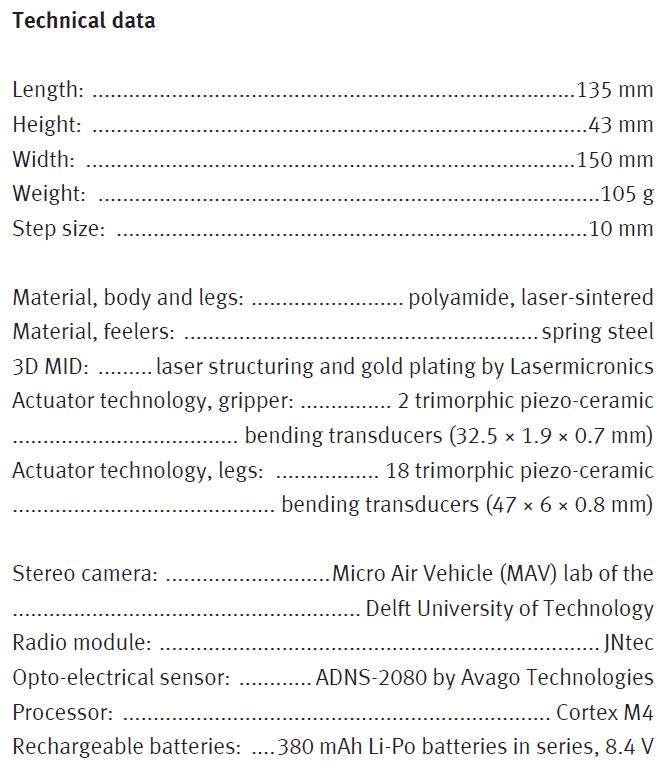יישום חדש לטכנולוגיית פייזו (piezo) – רכיבי אלו נשלטים בצורה מהירה ומדויקת, הם צורכים מעט מאוד אנרגיה, כמעט חסיני-שחיקה לחלוטין ואינם מצריכים הרבה מקום. שלושה מתמרי פייזו קרמים מתכופפים (piezo-ceramic) המתפקדים הן כמפעיל והן כאלמנט עיצובי, מוטמעים על כל ירך של הנמלה. על ידי הסטת החלק המתכופף העליון של המתמר, מרימה הנמלה את רגלה ועם זוג הפייזו התחתון, כל רגל יכולה להיות מוסטת במדויק קדימה ואחורה. כדי להגביר את העילוי הנמוך יחסית של הרגליים, פותח מחבר גמיש, המגדיל משמעותית את צעדיה של הנמלה.
