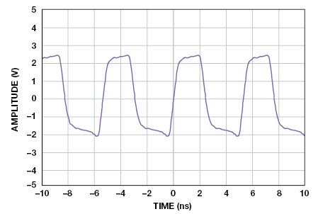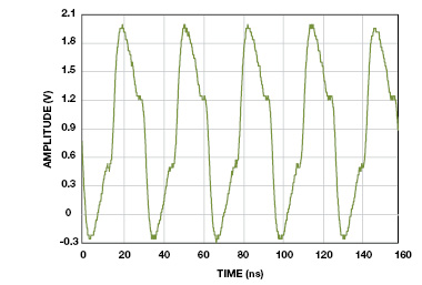 ה-ADC דוגם-RF נבדק לתדרי מבוא של עד 2 גיגה-הרץ ולכן נבחרה דיודת (Schottky RB851Y). טבלה 2 מראה את פרמטרי המפתח של ה-RB851Y העושים אותה מתאימה ליישום. נערכו בדיקות כדי להראות שהדיודות מנעו את מבואות ה-ADC מלעבור את ערך המתח המרבי של 3.2 וולט ביחס ל-AGND. איור 11 מראה מבור מוארק) פין VIN+ של ה-ADC) נחשף למתח גבוה ב-185 מגה-הרץ. דיודת Schottky מרתקת את המתח ל-3.0 וולט ביחס ל-AGND, ומונעת בכך את ה-ADC מלהגיע לגבול של 3.2 וולט. איור 12 מראה אות הפרשי במבוא של ה-AD9680 הקטום על-ידי דיודות Schottky.
