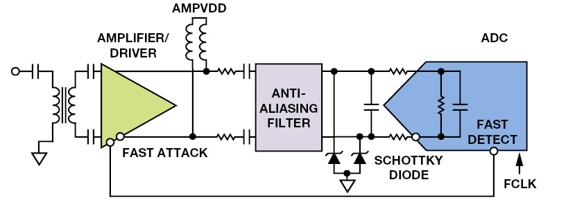 הטופולוגיה של איור 9 טובה כל עוד מתחי המבוא נמצאים בתוך התחום. אם, לדוגמה, נתיב מקלט זה נחשף למכה פתאומית של מתח גבוה במבוא, המוצאים עשויים לעלות למתח של פס ההספק של המגבר (5 וולט, במקרה זה). דבר זה מהווה ניד ענקי החורג מהמתח הנקבע למרב מוחלט במבואות ה-ADC. לגילוי המהיר יש במיסות מסוימת (28 מחזורי שעון או 28 ננו-שניות עבור ה-AD9680-1000), כך שבזמן שמוצא הלוגיקה של הגילוי המהיר אומר שעל המגבר ליזום תקיפה מהירה, ה-ADC כבר נחשף למתח הגבוה למשך מחזורי שעון אחדים. דבר זה עשוי לפגוע באמינות ה-ADC, כך שתכנוני מערכת שאינם יכולים לעמוד בפני סיכון זה יזדקקו למוד משני של הגנה. דיודת Schottky בעלת פעולה מהירה עם קיבול התקן ופרזיטי מאוד נמוך היא שימושית במצבים אלה. פרמטרים עיקריים להגדרת הדיודה ניתן למצוא בגיליון הנתונים.