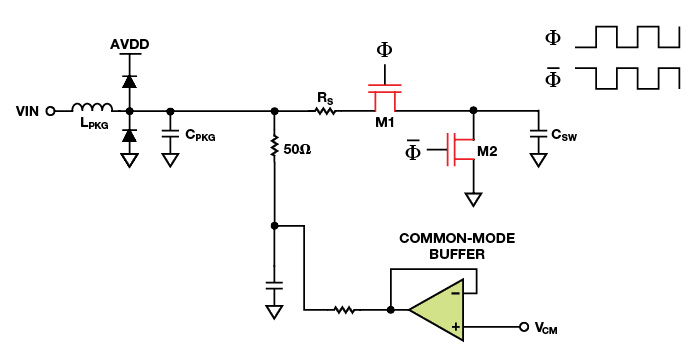 שה-ADC הוא חצוץ או לא. הנגד הטורי הנוסף הדרוש ב-ADCs לא-חצוצים כדי לטפל בתחזיר (kickback) המטען במבוא עשוי לשפר גם את ביצועי ה-SFDR. איור 1 ואיור 2 מראים מעגלי מבוא שווי-ערך מפושטים של ה-ADCs דוגמי ה-RF AD9625 הלא-חצוץ וה-AD9680 החצוץ. רק המבואות המוארקים מוצגים לשם פשטות.