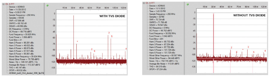 למרות שדיודות ה-TVS מגנות על מבואות ה-ADC על-ידי ריתוק של המתח העודף, הן פוגעות בצורה חמורה בביצועים ההרמוניים. איור 7 מראה FFT של ADC לא-חצוץ של 14-ביט, 250 MSPS, עם מבוא של 30 מגה-הרץ, ~1dBFS עם וללא דיודת TVS בקצה הסופי.
