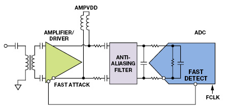 בשעה שרוחבי-הפס וקצבי הדגימה הגיעו לתחום ה-גיגה-הרץ וה-GSPS, ADCs דוגמי-RF מפשטים את תכנוני מקלט הרדיו מאחר שהם אינם דורשים כל כך הרבה דרגות עירוב בחזית ה-ADC, אך הדבר משאיר את מבואות ה-ADC פגיעים למאמצי מתח-היתר. איור 9 מראה תכנון קצה סופי מוזן על-ידי מגבר אופייני עבור ADC דוגם-RF. לדור החדש של מגברים מתוכנן במיוחד כדי למשק עם ADCs אלה יש מבוא בעל תקיפה מהירה שניתן לעצב דרך הממשק ההיקפי הטורי (serial peripheral interface) כדי להפחית את המוצאים לשבח שנקבע מראש. פין ההתקף-המהיר ניתן לעיצוב כדי לענות למוצא בעל הגילוי-המהיר מה-ADC הדוגם-RF. ה-ADA4961 היא דוגמה של הדור החדש של מגברים בעלי התכונה של תקופה מהירה. ה-AD9680 ו-AD9625 הן דוגמאות של ADCs דוגמי RF בעלי התכונה של גילוי מהיר.