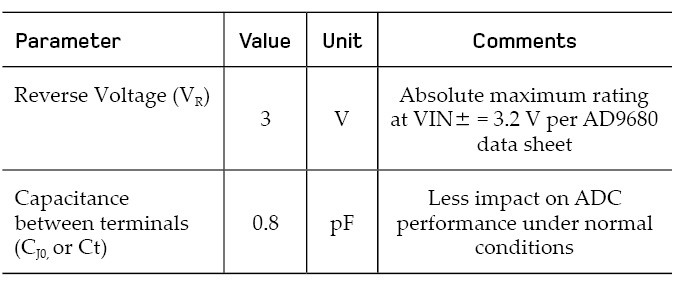 מתח כשל הפוך (VBR) – מתח המבוא המרבי בפיני המבוא של ה-AD9680 – הוא כ-3.2 וולט יחסית ל-AGND, כך שמתח כשל הפוך של 3 וולט נבחר עבור הדיודה.