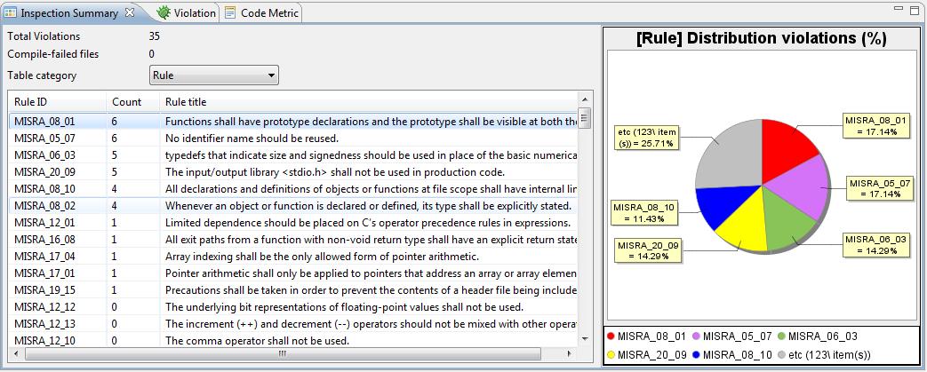 תמונה 2. בודק MISRA-C המובנה מציג סיכום הפרה עם תצוגה גרפית של סוגי השגיאות
