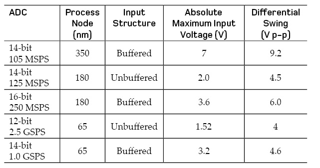 ADCs דוגמי-RF מיוצרים תוך שימוש בטכנולוגיה של תהליך CMOS תת-מיקרוני עמוקה, והפיזיקה של המוליך-למחצה אומרת לנו שגיאומטריות טרנזיסטור קטנות יותר תומכות במתחים מרביים נמוכים יותר. לכן, גיליון הנתונים מציין את המתחים המרביים המוחלטים שאין לעלות עליהם בשל שיקולי אמינות. השוואה בין גיליונות נתונים של התקנים ישנים יותר עם ה-ADCs דוגמי-ה-RF החדישים מוכיחה את הפחתת מתח זו.