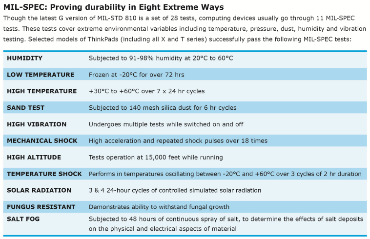 ל-11 בדיקות MIL-STD שעוברים ניידים אלו, הם עוברים גם מעל ל-200 בדיקות פנימיות. ה-ThinkPads נבנו כדי לשרוד כל דבר, החל מסביבות קשיחות ועד לבלאי הנובע מנסיעות עסקים רצופות, תוך שהם נראים טוב ושומרים על ביצועיהם במשך שנים.