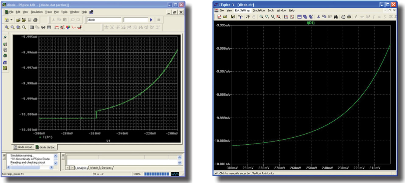 איור 1. אי רציפות בעקומת ה I-V של דיודה ב- PSpice )משמאל( לעומת עקומה רציפה ב- LTspice )ימין(, אי רציפויות משפיעות בצורה שלילית על יכולת סימולטור ה- SPICE לפתור מעגלים שאינם לינאריים