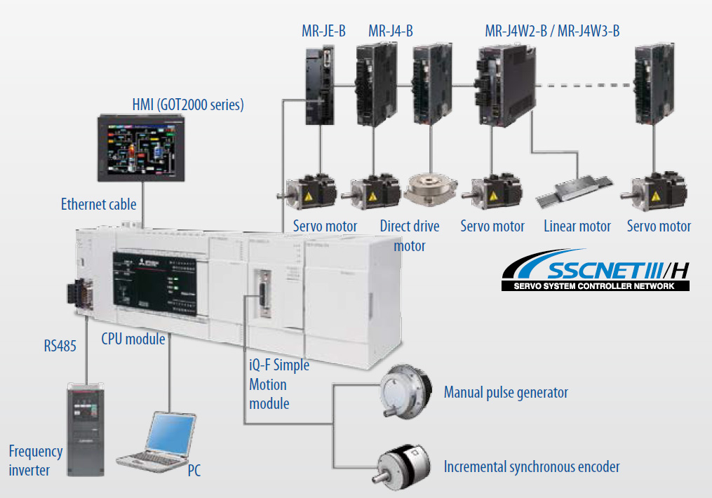 FX5-40SSC-S יכול לעבוד כל בקרי הסרוו מסדרת MR-J של מיצובישי, ולמעשה מקבלים מערכת של “PLUG&PLAY” החיבור הוא באמצעות III/H  של מיצובישי. רשת אופטית זה מספקת 150 Mbits / sec half duplex ו-300 / Mbits ב-FULL DUPLEX. זמן המחזור הוא 0.22 מיקרו שניות ולמעשה הוא המהיר ביותר בעולם. שימוש בסיבים האופטיים נותן מעטה הגנה מפני רעשים ומקנה לו אמינות גבוהה ביותר.