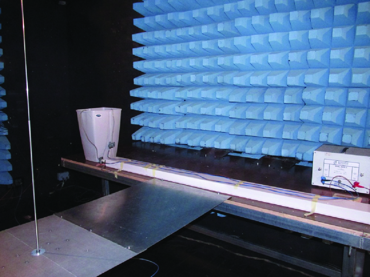 בדיקת הפרעות מוקרנות לפי התקינה הצבאית: שימו לב- לשולחן הנחושת עם הארקה עליו נפרסת הרתמה הצבאית בבדיקה