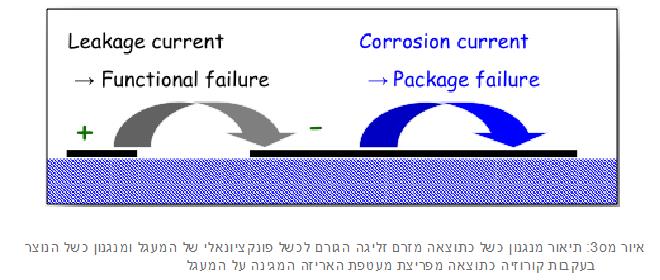 איור 3. תאור מנגנון כשל כתוצאה מזרם זליגה הגורם לכשל פונקציונלי של המעגל ומנגנון כשל הנוצר בעקבות קורוזיה כתוצאה מפריצת מעטפת האריזה המגינה על המעגל