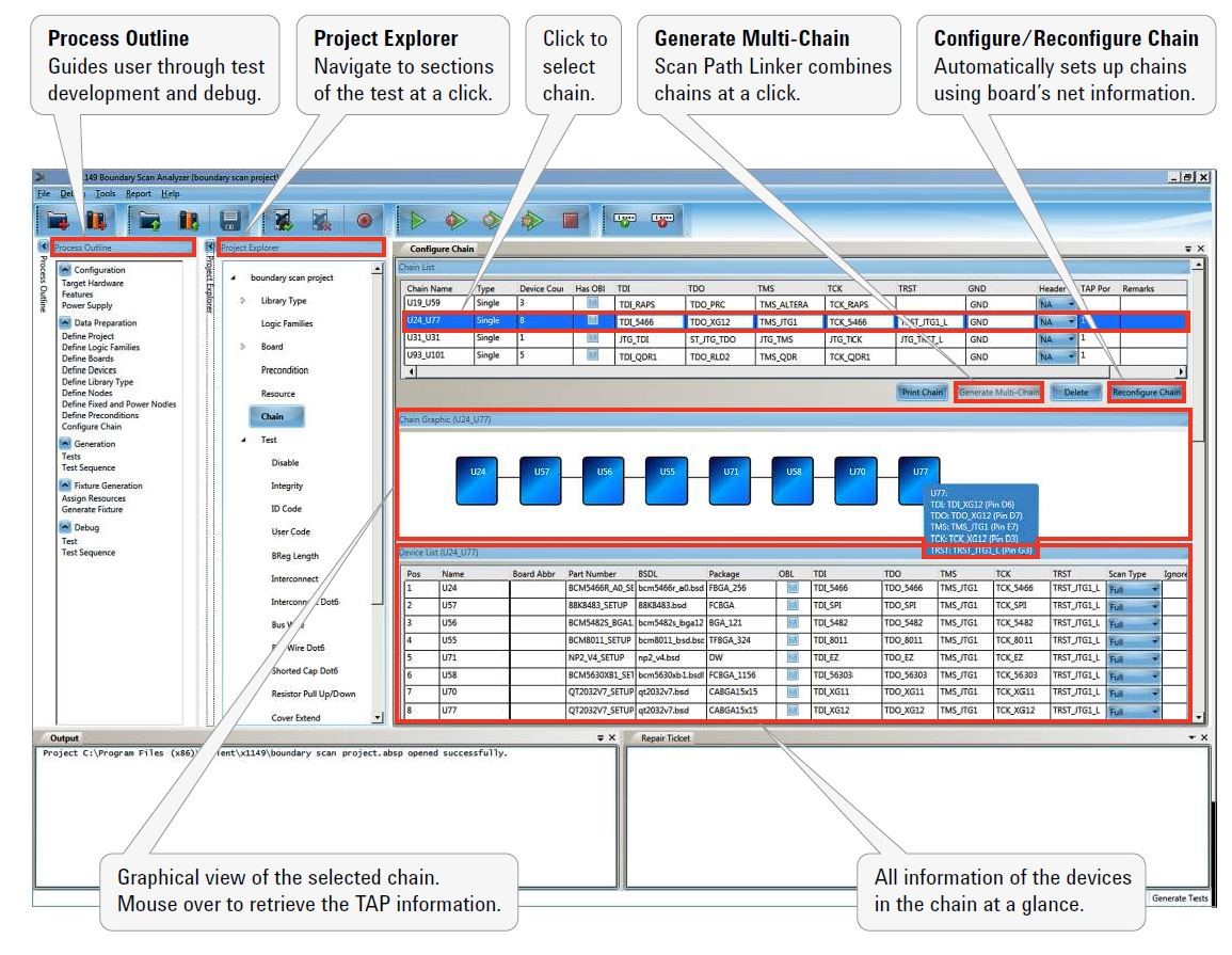 מערכת סריקת הגבולות מגיעה עם ממשק תוכנה (ראה איור 5) שמאפשר למהנדס הבדיקות ליצור תוכניות בדיקה ל-PCBA.