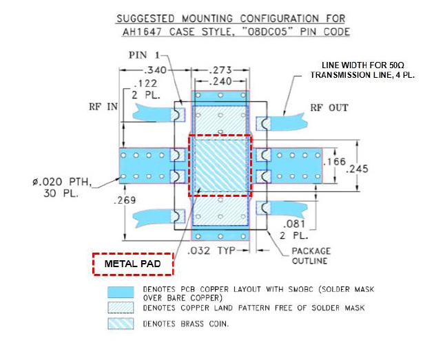 איור 3. תצורת ההתקנה המוצעת עבור SYDC-19-52HP + תוך ציון האזור של רפידת המתכת בתוך בית היחידה. את המעגל המודפס של הלקוח יש להכין עם פתח בממדים התואמים כדי שיכיל את בסיס המתכת החשוף להעברת החום