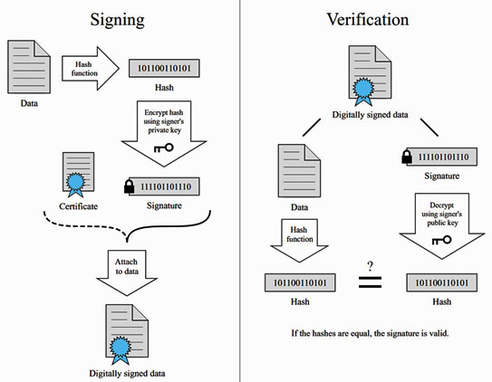 אימות התוכן הספרתי מובטח על ידי שיטת החתימה הספרתית, מבוססת המפתח הציבורי. הצפנה של מפתח ציבורי מבוססת על זוג מפתחות. מפתח פרטי שמאוחסן באופן סודי (למשל KPRIV), ומפתח ציבורי (למשל KPUB) זמין לכל אחד. במפתח הפרטי אפשר להשתמש כדי לחתום תוכן ספרתי. המנפיק של התוכן הספרתי משתמש במפתח הפרטי שלו המוחזק באופן סודי, על מנת לזהות את עצמו כמנפיק. המפתח הציבורי יכול לשמש כל אחד כדי לאמת חתימה של תוכן ספרתי. שני מפתחות אלו קשורים יחד. למעשה, חתימה על תוכן עם המפתח KPRIV מפיקה חתימות ספרתיות שאפשר לאמת אותן בהצלחה רק על ידי המפתח KPUB. אין עוד מפתח ציבורי אחר שיכול לעשות את העבודה. בניגוד לכך, אם חתימה אומתה בהצלחה בעזרת מפתח KPUB, אין כל ספק שהיא נחתמה על ידי מפתח KPRIV ולא על ידי כל מפתח אחר.