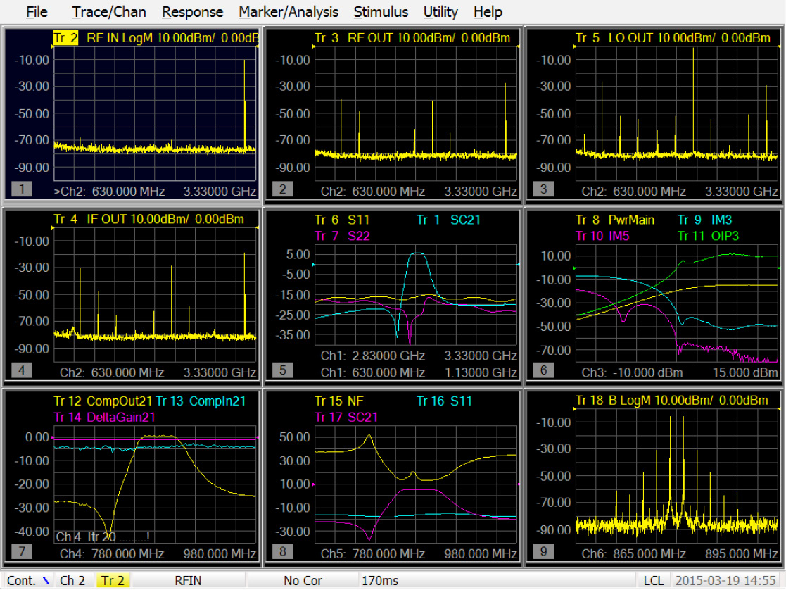 איור 5. באמצעות יכולת SCMM, תצוגה זו של תשעה מעקבים מראה חמש מדידות ספקטרום יחד עם ארבע מדידות VNA כולל רווח המרה (באמצע), דחיסת רווח (שמאל למטה) וסיפרת רעש (אמצע למטה)
