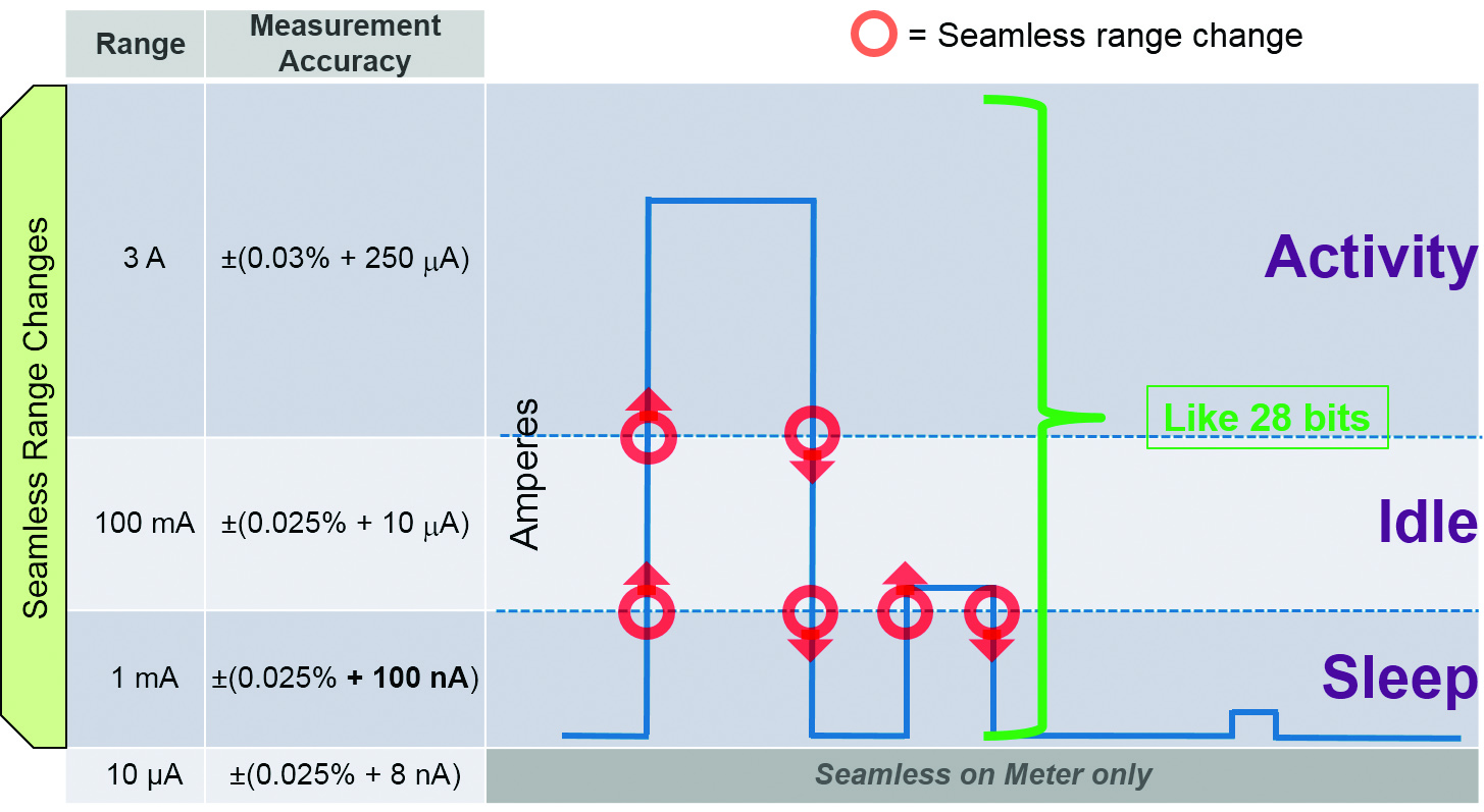 קביעת טווח הזרם החלקה היא טכנולוגיה הרשומה כפטנט שמאפשרת ל-SMU של Keysight לשנות את טווח המדידה תוך שמירה על מתח יציאה יציב ללא צניחות כלשהן עקב שינוי הטווח. תכונה זו מאפשרת לך למדוד את השיאים בטווחי זרם גבוהים ולמדוד את הזרם במצב שינה באמצעות הטווח 1-mA FS, שיש לו 100 של שגיאת קיזוז. בשגיאת קיזוז נמוכה (שגיאת קיזוז של 100-nA היא 10% ב-1 או 1% ב-10), סדרי הגודל טובים יותר לעומת DMM מסורתי.