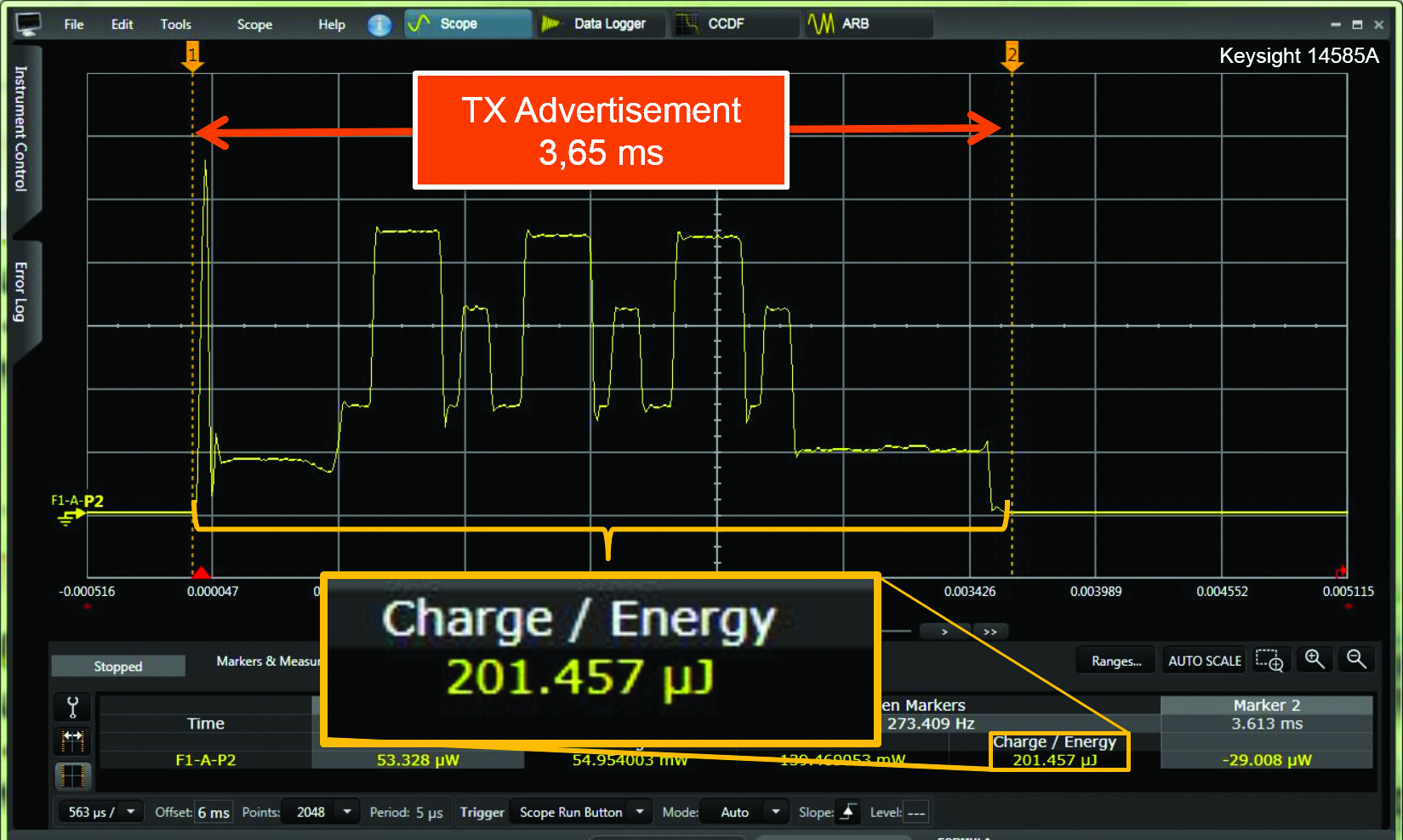 באמצעות תוכנת הבקרה והניתוח 14585A של Keysight, ניתן למדוד אנרגיה ישירות בג’אולים. לדוגמה, ייתכן שתמדוד את החשמל הנצרך בשידור חבילה (ראה איור 5) הנלכד באמצעות trigger. זהו אחד מהיתרונות של שני דיגיטייזרים למתח ולזרם עם דגימה סימולטנית המאפשרים מדידות אנרגיה, נקודה אחר נקודה. ניתן לקרוא ג’אולים בקלות כערך בין הסמנים, ומתכנתים יכולים להתקדם צעד נוסף על ידי הגדרת ג’אולים/ביטים משודרים.