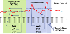 - איור 3. אוגר נתונים (data logger): כל הדגימות משולבות בתקופות דגימה רציפות. אף דגימה לא אובדת. בכל תקופת דגימה יש גם ערכי מינימום ומקסימום.