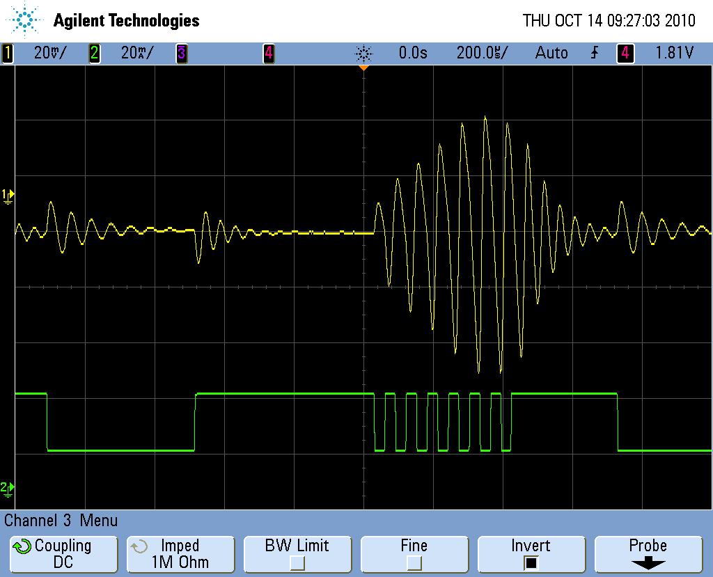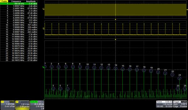 לזמן עלייה בקצה של 350pS יש רוחב-פס של 3dB של כ-1 גיגה-הרץ; וירידה בערך כ-20dB בדקדה. כחוק כללי, יש למדוד את התוכן הספקטראלי בדקדה מעל fmax. דבר זה מעניק גבול עבור תהודות של תדר גבוה כאשר יש עדיין תוכן באות. כך שעבור שער מהיר בעל זמן עלייה של 350pS יהיה נבון למדוד את התוכן הספקטראלי עד 10 גיגה-הרץ. דוגמה של שער CMOS מוצגת באיור 5. עם זמן עלייה של 417pS התוכן הספקטראלי הוא הרבה מעל 2 גיגה-הרץ בפיני ההזנה של השער, כך שתרצה להשתמש בסקופ של 4 גיגה-הרץ לפחות ועדיף 20GS/s.