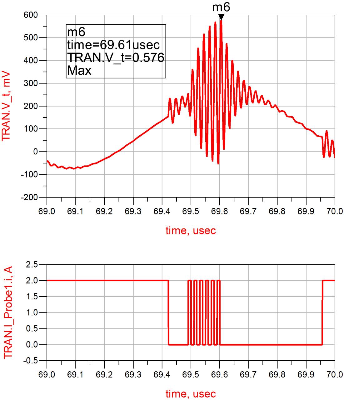 - איור 3. אותו המתח הנובע מצעד זרם תלוי במצבו היחסי אל תהודת PDN
