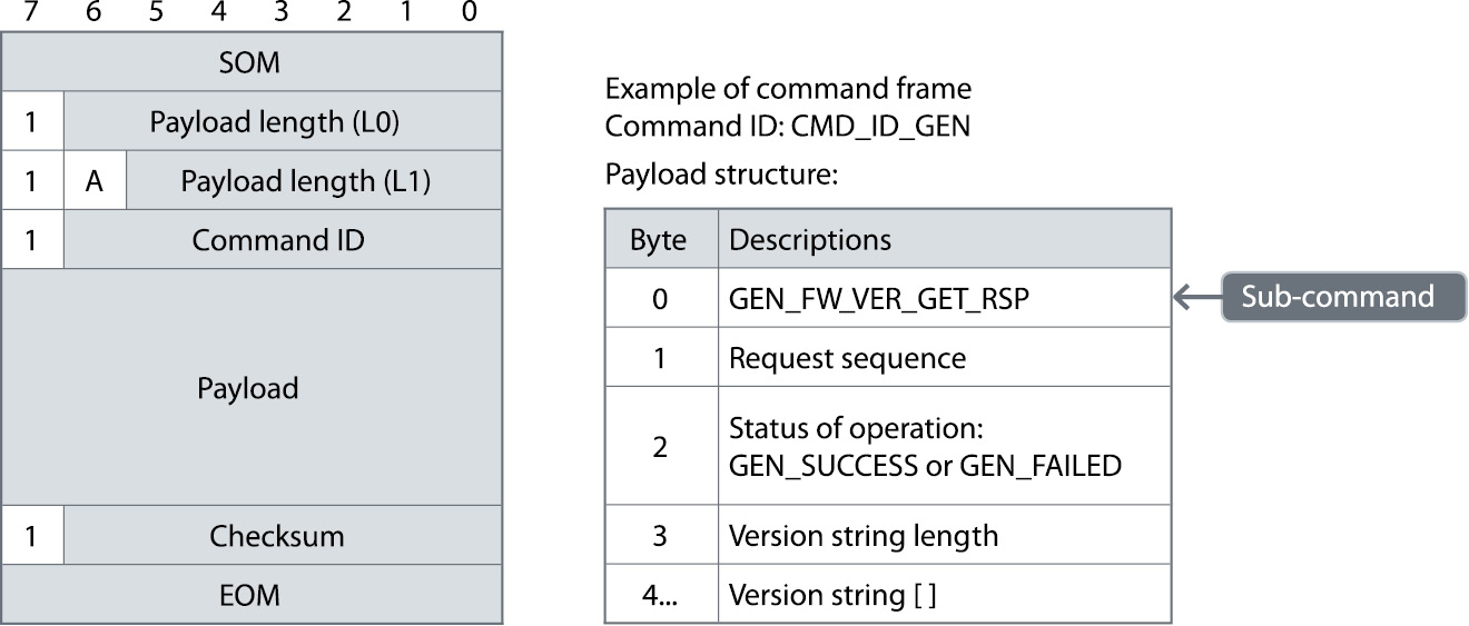 איור 2 מציג כיצד מבצעים החלפת מסרים בין יישום הלקוח ומודול Wi-Fi מסוג YD. איור 3 מראה חלק מהוראות הפיקוד שניתן להפיק דרך ממשק ה-UART או SPI כדי לגלות נקודות גישה של Wi-Fi, להציב תקשורת ולהעביר נתונים.