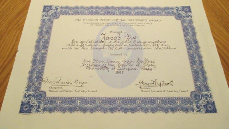 - תעודת פרס מרקוני שהוענקה לזיו בשנת 1995