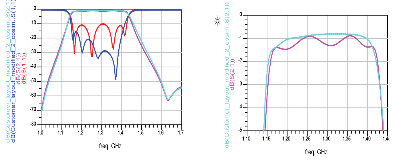 איור 6. תרשימים של הפסדי החזרה של בפרישה של מעגל הלקוח לעומת הפרישה החלופית המוצעת עם חיבור סליל של 18nH במוצא