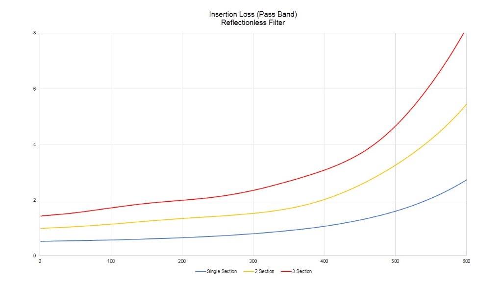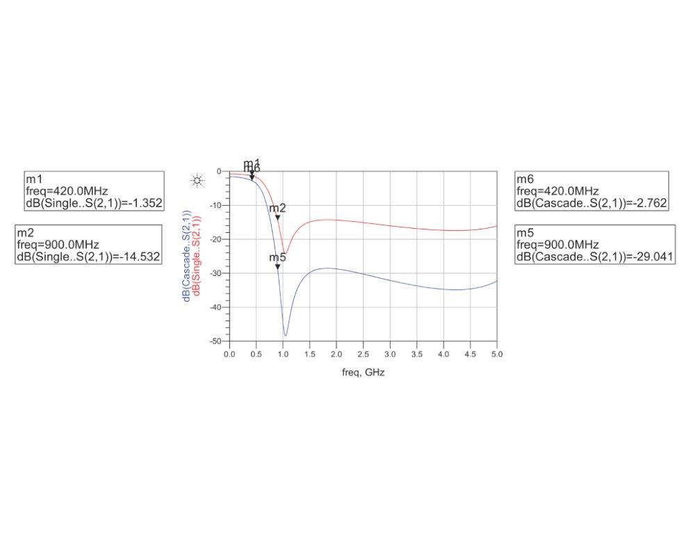 הדגם XLF-421+ של מסנן ללא החזרות ישמש כדוגמה בהדגמה הבאה. הדגם XLF-421+ הוא מסנן מעביר נמוכים ללא החזרות עם פס העברה מ-DC עד 420 מגה הרץ. הוא מגיע להפסדי מעבר של 1.4dB בפס ההעברה, לדחייה של 14dB בפס החסימה מ-900 עד 5200 מגה הרץ ולדחייה של 24dB בפס החסימה מ-5200 עד 18000 מגה הרץ. הדמיה של פרמטרי S כאשר שני מסננים דגם XLF-421+ מחוברים בטור נראית באיור 1. נתוני ההדמיה עבור הפסדי המעבר (איור 2) מראים את השיפור הצפוי בדחייה בפס החסימה וכן שיפוע קצה חד יותר במעבר, כאשר שני מסננים מחוברים בטור. בינתיים ההשפעה על הפסדי ההחזרה בכניסה וביציאה (איור 3 ואיור 4) היא מזערית. ראוי לשים לב שנתוני ההדמיה של שני מסננים ללא החזרות שמחוברים בטור, לא מציגים כל אדוות, עיוותים או התנהגויות לא רצויות אחרות, שהיו מופיעות אם במערכת היו מוצגים החזרות או אי יציבויות בפאזה.