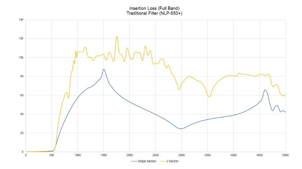 - איור 5c: הפסדי מעבר של NLP-550+ עבור חוליה אחת ושתי חוליות על פני פס ההעברה